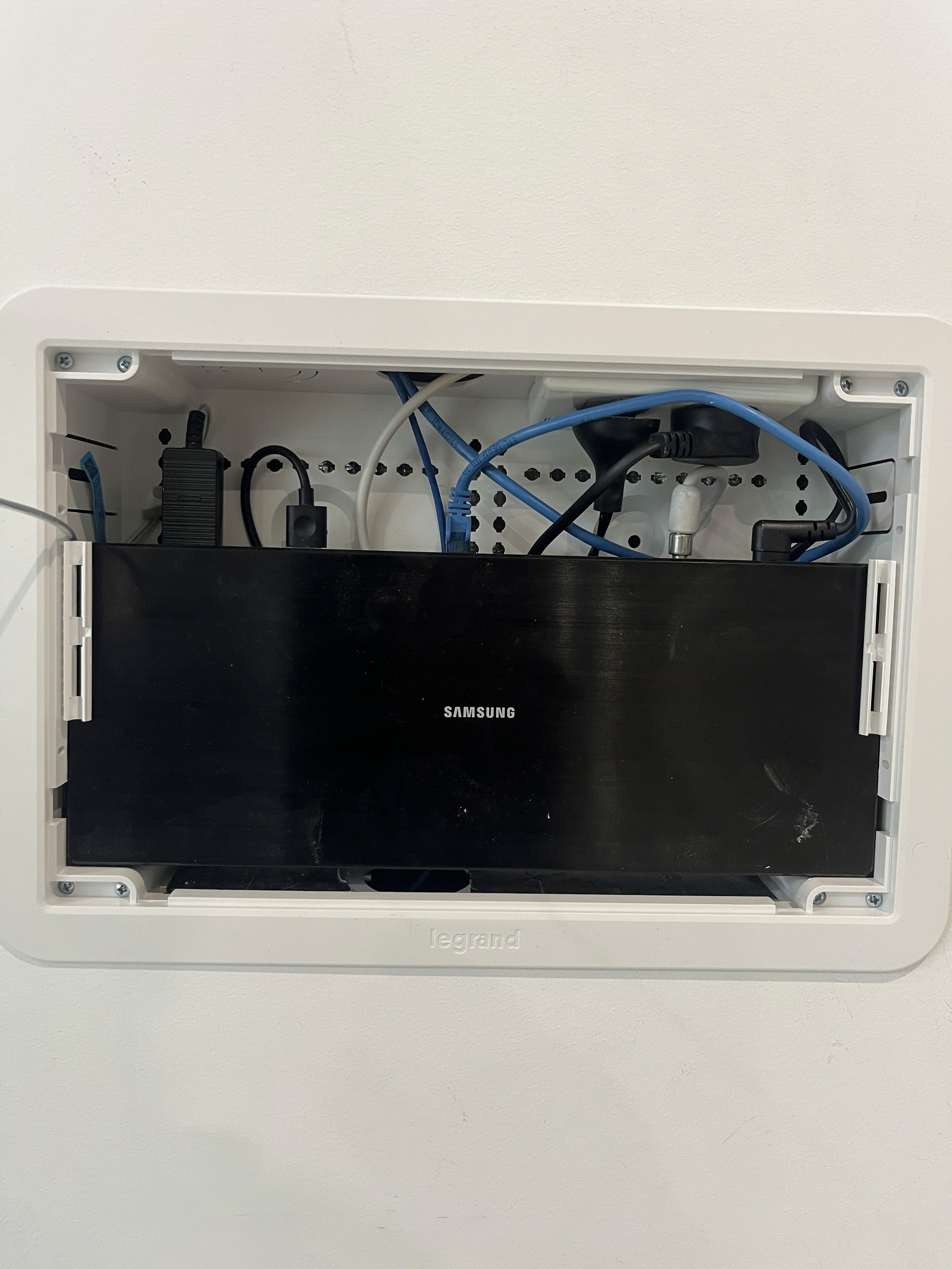 recess box is typicaly used for one-connect samsung tv's but can be used for apple tv etc. TV screen must be removed to access box.