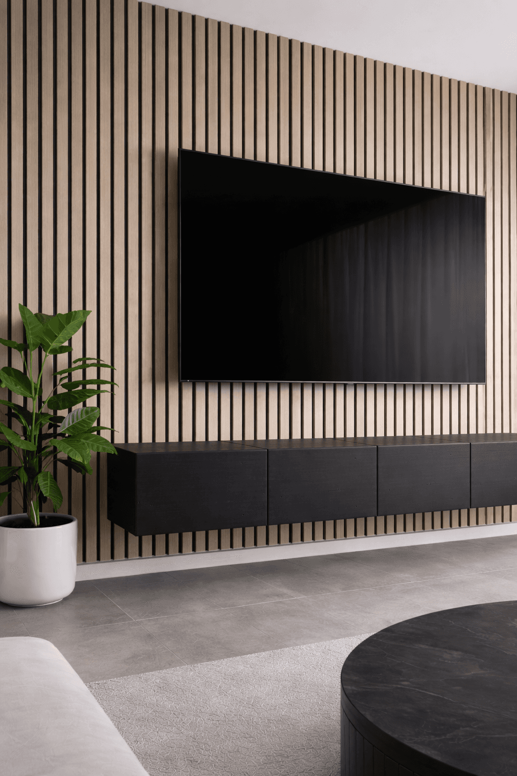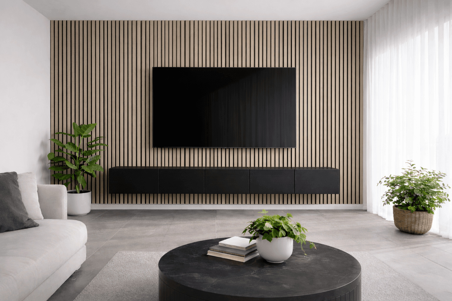 Before installation, we confirm the panel layout, colour selection, and overall wall coverage with you, based on the room, screen position, and surrounding elements.