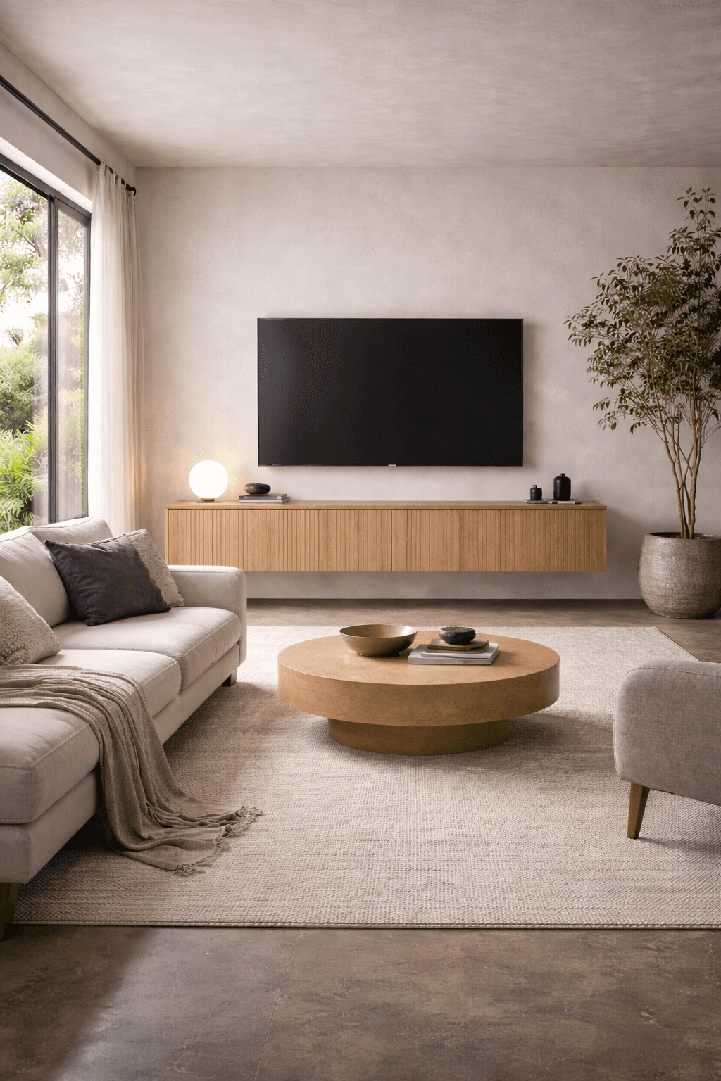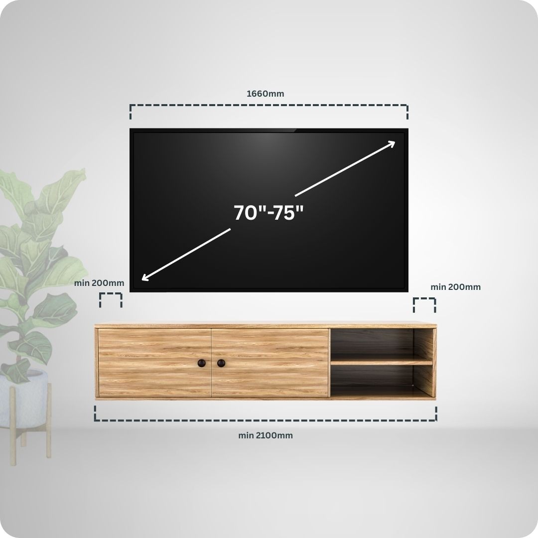 A TV unit that is narrower than the television above it fails to visually anchor the screen. The TV begins to dominate the wall and can appear oversized or top-heavy. A wider unit frames the television properly, grounding the display and creating a more intentional, proportioned design.